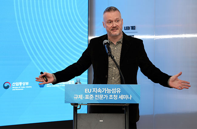 한국섬유산업연합회(회장 최병오, 이하 섬산련)는 지난 11일(수) 섬유센터에서 ‘EU 지속가능섬유 규제·표준 전문가 초청 세미나’를 개최하고, 2026년부터 순차 시행*되는 EU 에코디자인 규정(ESPR)과 디지털 제품 여권(DPP) 도입에 따른 국내 기업의 대응 전략을 논의했다.