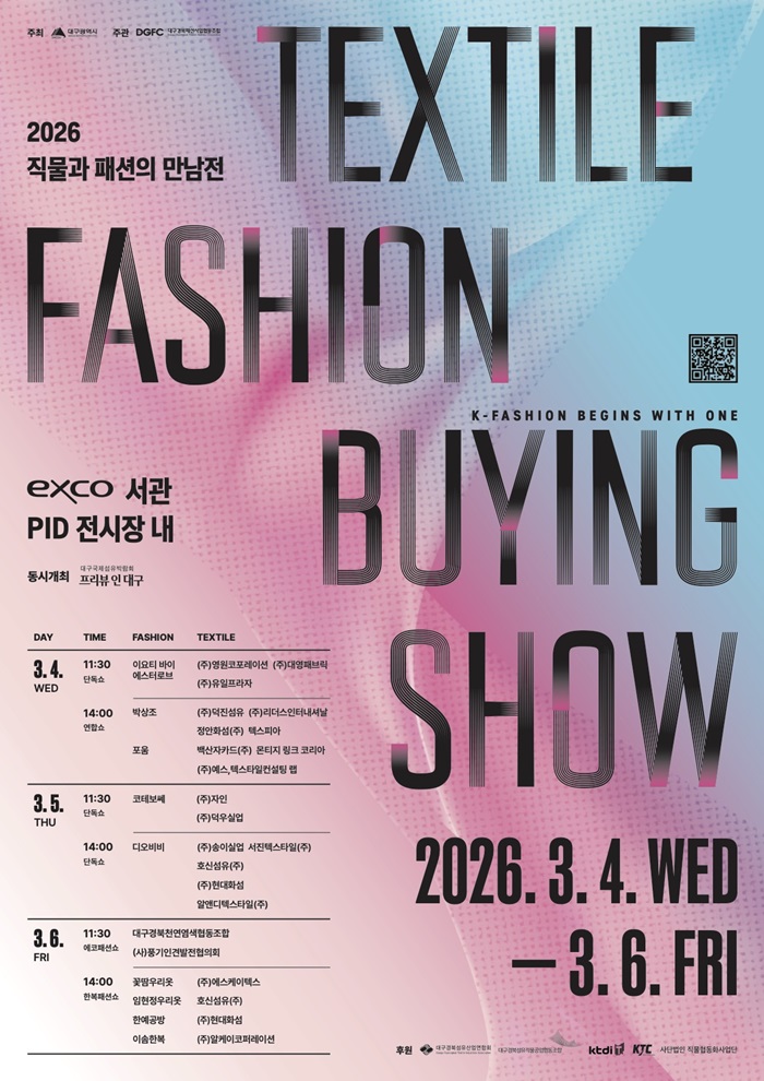 대구광역시 주최, 대구경북패션사업협동조합(이사장 정순식)이 주관하는 ‘2026 직물과패션의 만남전(직패전)’이 오는 3월 4일부터 6일까지 3일간 대구 EXCO 서관 전시장에서 2026 대구국제섬유박람회(PID)와 함께 동시행사로 개최된다.