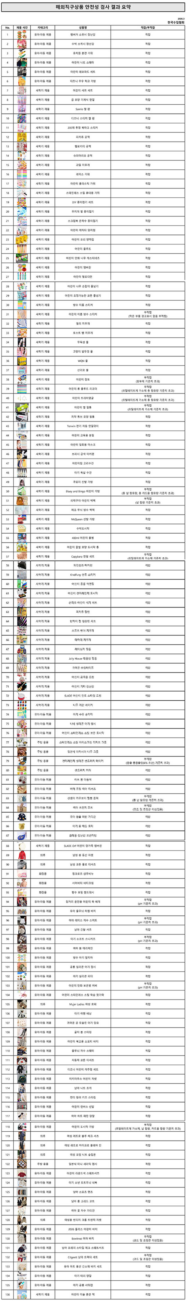 검사 대상은 어린이 학용품과 완구 등 새학기 관련 제품과 간절기 의류 등 봄철 수요가 높은 품목으로, 총 136개 제품을 대상으로 진행됐다. 시험·검사는 국내 공인 시험·검사기관인 KTR, KCL, KTC, KATRI, KOTITI, FITI, SGS 등 7개 기관이 참여해 제품의 물리적 안전성과 유해물질 함유 여부 등을 종합적으로 평가했다.