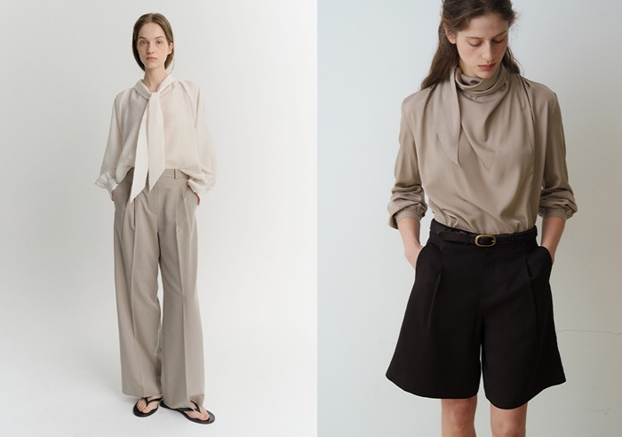 브랜드별 타이 블라우스 제품 이미지 (좌)이아 룩북 (우)오브베이지 룩북