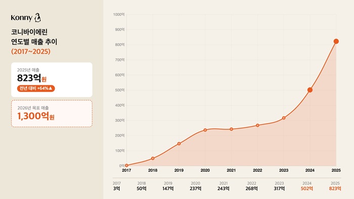 글로벌 육아 라이프 스타일 브랜드 ‘코니(Konny)’를 운영하는 코니바이에린(대표 임이랑)이 2025년 연간 매출 823억 원을 기록하며 전년 대비 약 64% 성장했다고 1일 밝혔다. 설립 이후 매년 성장세를 이어오는 가운데, 2년 연속 60%대 성장률을 기록했다.