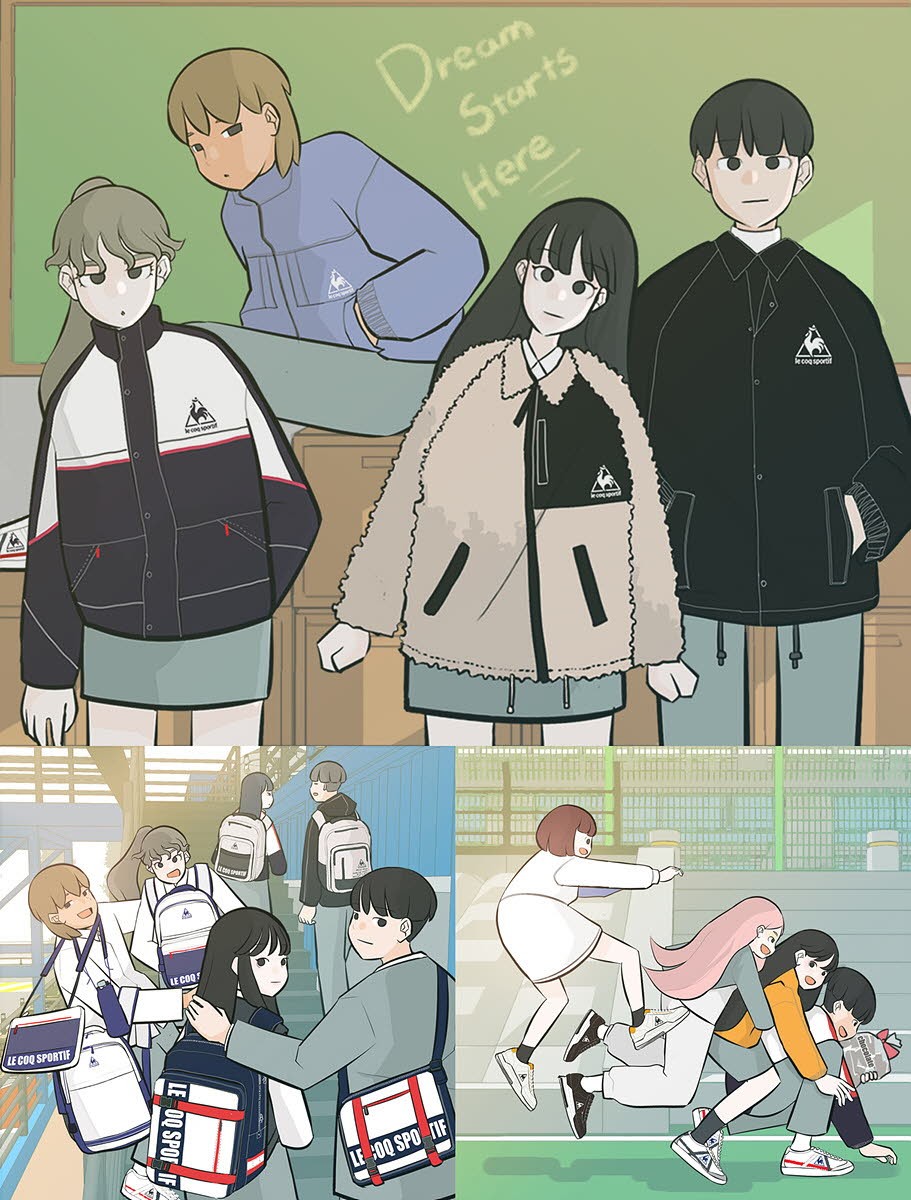 특히 이번 시즌 르꼬끄는 네이버 웹툰의 인기 작품 ‘연놈’과 스타일링 협업을 진행했다. 상하 작가의 웹툰 ‘연놈’은 10대들의 학원 로맨스를 중심으로 연재 때마다 높은 조회 수를 기록하며 수요 웹툰 차트 상위권에 랭크되며 꾸준한 사랑을 받고 있는 웹툰으로, ‘연놈’의 캐릭터들이 르꼬끄의 신학기 컬렉션으로 스타일링한 웹툰 컷을 공개한 것. 아우터와 모듈백팩, 포폴라 스니커즈를 웹툰 속 교복과 함께 매칭해 캐릭터별 개성이 돋보이는 스타일링을 사실적으로 표현해 화제를 모으고 있다.