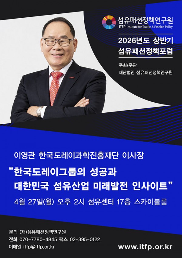 재단법인 섬유패션정책연구원(이사장 서봉준)이 오는 27일(월) 오후 2시, 서울 강남구 섬유센터 17층 스카이볼룸에서 2026년도 상반기 섬유패션정책포럼을 개최한다. 이번 포럼은 이영관 한국도레이과학진흥재단 이사장을 초청한 특별 강연으로 진행된다.