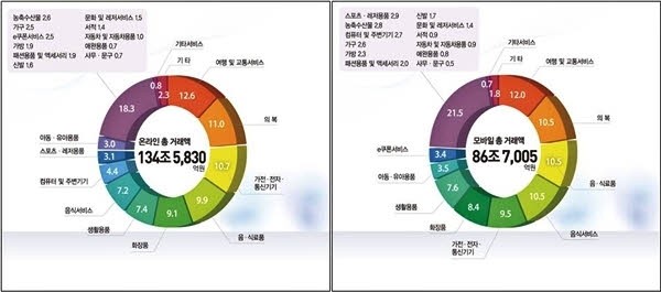 이중 모바일은 의복 9조 1,390억원(12.6%) 신발 1조 4,473억원(13.7%), 가방 2조 239억원(22.0%), 패션용품 및 액세서리 1조 7,748억원(13.5%), 스포츠·레저용품 2조 4,906억원(14.5%), 화장품 7조 3,114(32.6%), 아동·유아용품 3조 185억원(13.0%)에 달했다.