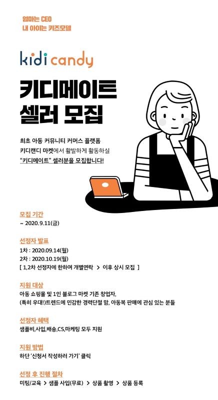 키디캔디 런칭을 대비해 모집을 시작한 키디메이트 셀러에는 아동 패션에 관심이 높은 주부, 아동 관련 부문의 기창업자, 투잡에 대한 의지가 있는 워킹맘 등은 누구나 지원할 수 있다. 키디메이트 셀러로 선발된 지원자는 일정 기간의 교육 프로그램을 수료한 후 서울 남대문에 위치한 키디캔디 마켓 쇼룸에 방문해 본인이 판매할 아동복/육아용품 등을 선정한다.