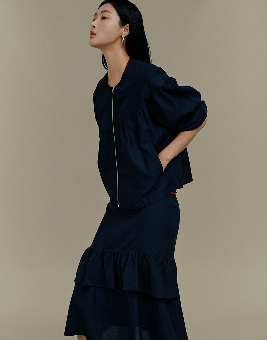 포멀 재킷보다 조금 더 캐주얼한 리넨 블렌디드 셔링 점퍼는 리넨 혼방 소재로 제작해 청량한 터치감이 느껴진다. 앞뒤 상단에 잔잔한 셔링을 주어 페미닌한 포인트를 더했으며, 칼라리스 디테일과 소매 밑단 니트 배색으로 밸런스를 잡아 완성했다. 간절기 시즌에 가볍게 걸치기 좋은 활용도 높은 아이템이다.
