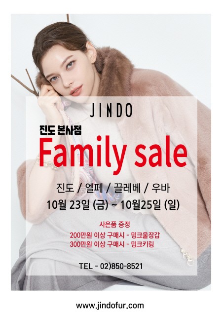모피 명가 진도(대표 임영준)가 시즌맞이 패밀리 세일을 실시한다. 진도는 오는 23일부터 25일까지 가산동 본사 직영점에서 3일간 시즌맞이 패밀리 세일을 진행한다고 밝혔다.
