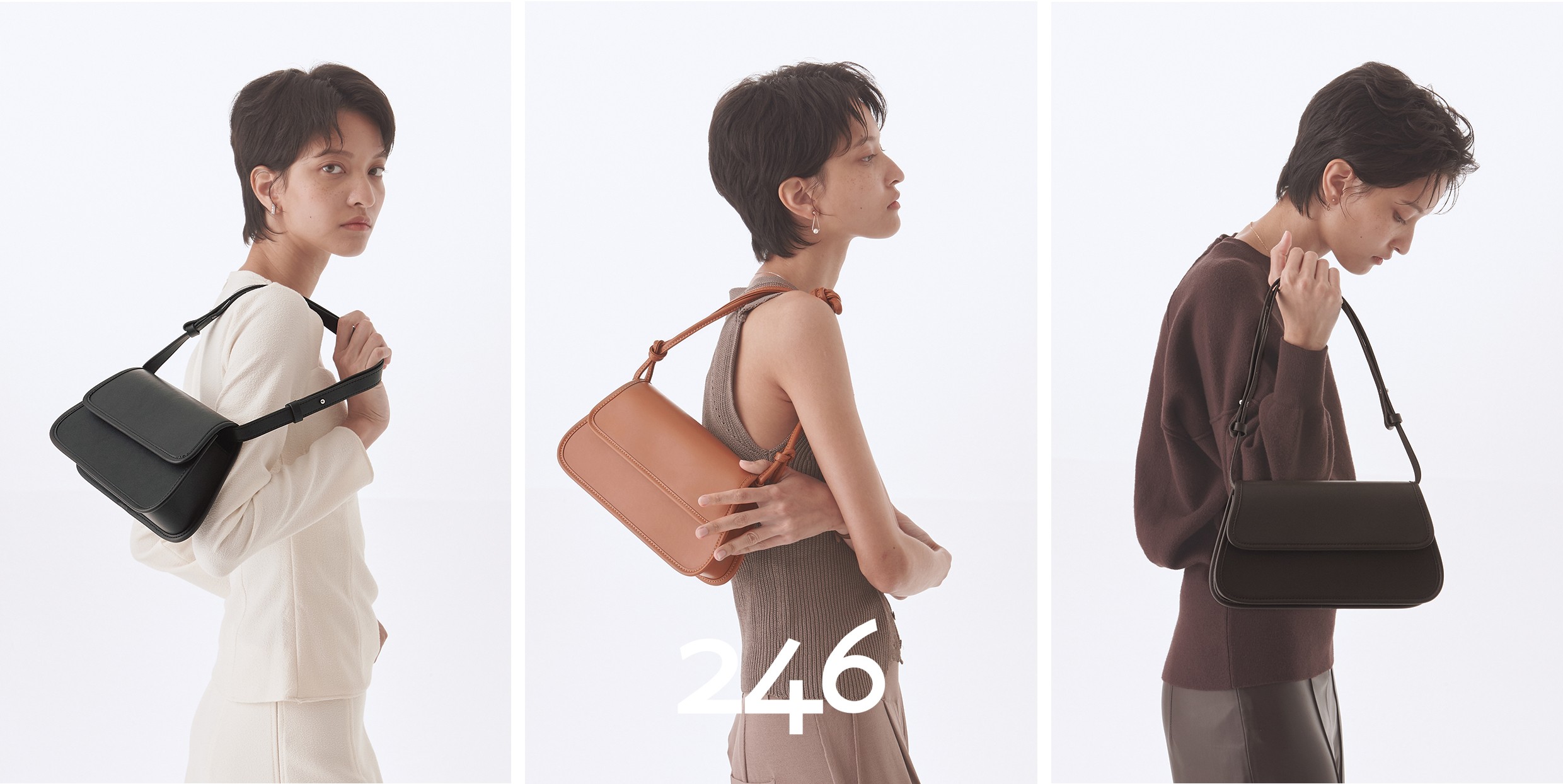 미니멀한 디자인이 돋보이는 코에 컬렉션은 브랜드 이니셜을 가방 전면에 프린트하거나 장식하지 않는 메종(MAISON)246의 로고리스 아이덴티티를 반영한 클래식&미니멀(Classic&Minimal) 스타일의 3WAY(클러치, 크로스, 숄더) 백으로 군더더기 없는 미니멀 쉐입과 활용성에 중점을 둔 20FW 신상품이다.