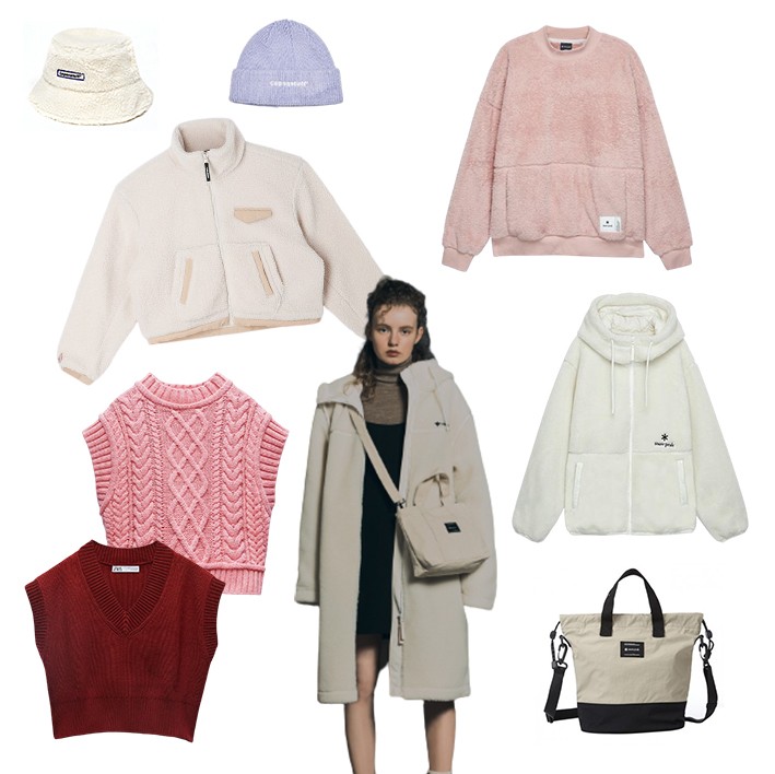 요즘 캠핑이나 차박에도 감성을 더하는 것이 트렌드로 자리 잡으면서 패션 또한 그에 맞게 감성적이고 로맨틱하게 연출하는 이들이 늘어나고 있다. 캠핑이나 차박 하면 생각나는 편안하고 캐주얼한 무드가 아닌 로맨틱한 캠핑룩을 연출하고 싶다면 핑크나 아이보리 등 화사한 컬러감이 돋보이는 아이템들을 활용해보자. 특히, 보들보들한 촉감의 플리스는 스타일은 물론, 보온성까지 만족할 수 있어 차박이나 캠핑 시 활용도가 높다. 또 화사한 컬러감의 옷이 부담스럽다면 비니나 버킷햇 등의 모자나 가방을 포인트 아이템으로 활용하면 손쉽게 스타일리시한 스타일을 연출할 수 있다.