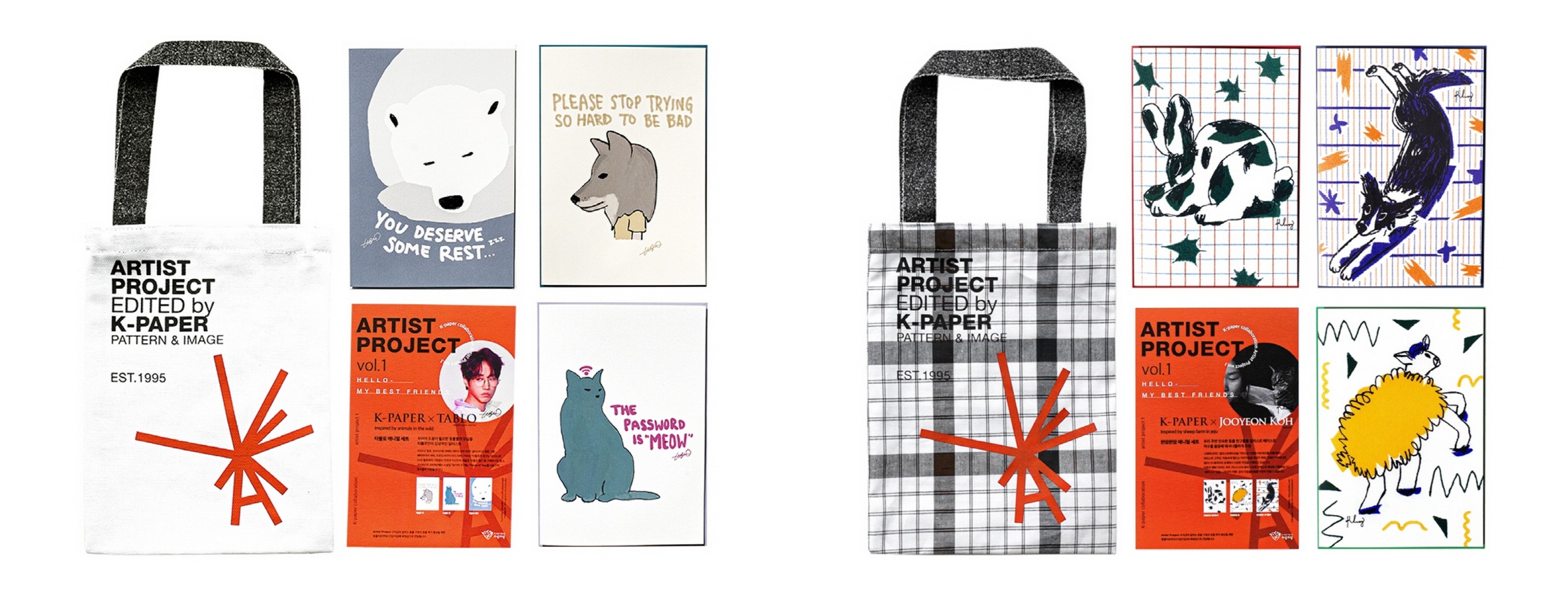 첫 번째 프로젝트는 싱어송라이터 타블로와 자신만의 철학적인 일러스트로 사랑받는 고주연 작가와 함께 했다. 아티스트 타블로와 선보이는 ‘타블로 애니멀 카드 3종’은 야생 동물에 영감을 받아 우리의 도움이 필요한 동물의 모습을 그만의 감성적인 일러스트로 표현했다. 또한, 비욘드 클로젯의 비숑프리제 캐릭터로 독보적인 성공을 거둔 고주연 작가와 함께한 ‘고주연 애니멀 카드 3종’은 제주의 양떼 목장에 영감을 받아 제작되었다. 친숙한 동물 친구들을 일러스트 베이스로 자수를 활용해 패셔너블하게 표현했다.