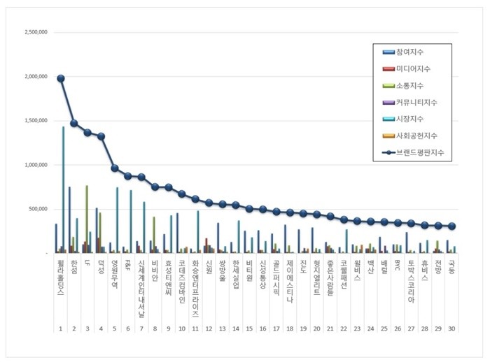 3위, LF 브랜드는 참여지수 100,366 미디어지수 134,360 소통지수 771,049 커뮤니티지수 96,422 시장지수 247,891 사회공헌지수 17,467이 되면서 브랜드평판지수 1,367,554로 분석되었다. 지난 10월 브랜드평판지수 769,494와 비교하면 77.72% 상승했다.