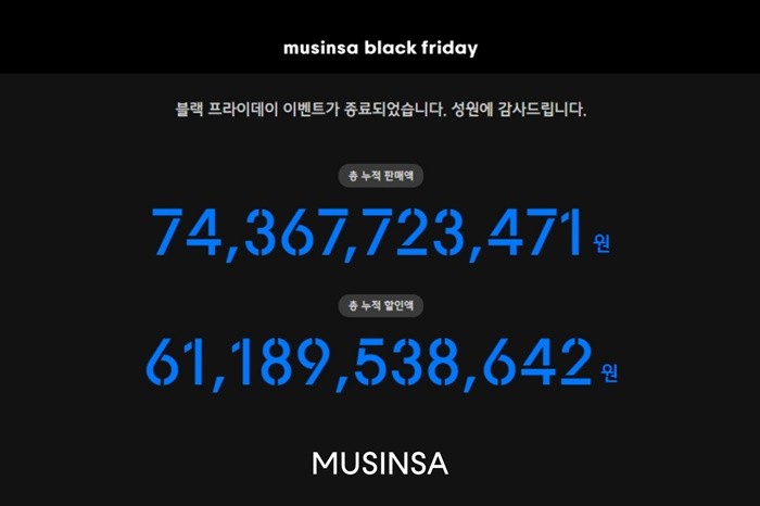 이는 지난해 개최한 블랙 프라이데이 거래액 대비 105% 이상 증가한 것으로, 하루 평균 124억 원 넘게 거래된 셈이다. 무신사는 올해 블랙 프라이데이 행사를 2019년보다 이틀 더 늘린 11월 26일부터 12월 1일까지 6일간 할인을 진행했다.