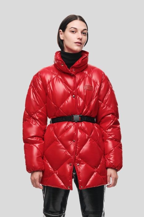 알리스케아두에는 듀베티카만의 세련되고 볼드한 다이아몬드 퀄팅 사이즈와 트렌디한 웨빙벨트가 포인트로, 아워글래스 실루엣을 강조한 매력적인 다운자켓이다.