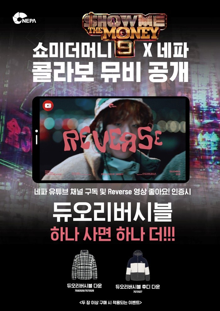 아웃도어 브랜드 ‘네파’가 지난 18일 성황리에 시즌 막을 내린 Mnet ‘쇼미더머니9’과의 콜라보레이션 뮤직비디오 공개를 기념해 특별 프로모션을 실시한다. 파격적인 혜택으로 무장한 이번 이벤트는 오는 1월 31일까지 듀오 리버시블을 2장 이상 구매하는 모든 고객에게 50% 할인, 즉 한 장 가격으로 두 장을 살 수 있는 프로모션이다.
