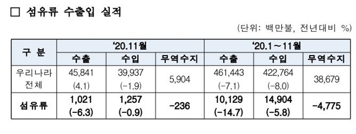 지난해 섬유 수출은 전년비 8% 감소한 130억 달러, 수입은 전년과 비슷한 170억 달러를 기록했다. 따라서 섬유 수출은 2년 연속 감소하면서 무역수지 적자 폭이 커졌다. 올해 우리나라 전체 수출이 11월 말 현재 7.1% 준 것과 비교하면 섬유 수출은 감소 폭이 컸다. 이는 코로나19 사태로 전 세계 의류 소비가 급격히 줄었기 때문으로 풀이된다.