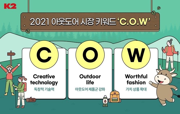 K2가 제시하는 ‘카우(COW)’는 ▲독창적 기술력(Creative technology) ▲아웃도어 제품군 강화(Outdoor life) ▲가치 상품 확대(Worthful fashion)를 의미한다.
