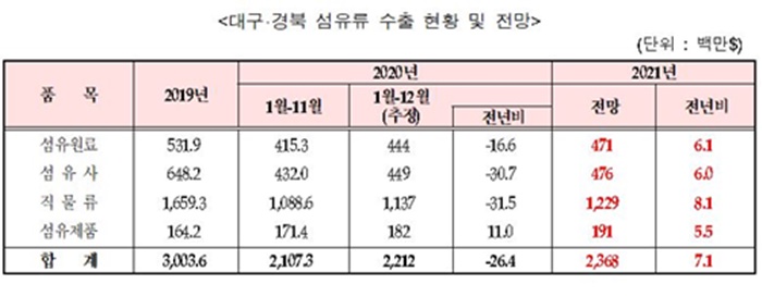 2021년 대구·경북 지역 섬유 수출은 코로나19 종식 여부의 불확실성으로 인한 글로벌 경기침체, 글로벌 경쟁 심화로 수출단가 인상제약 등의 부정적인 요소가 있으나 2020년의 수출감소에 따른 기저효과 및 글로벌 섬유 수요 회복 등의 영향으로 올해 대비 7.1% 증가한 2,368백만 달러로 전망된다.