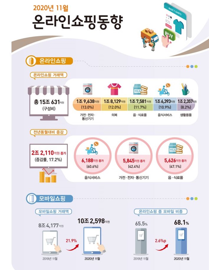 한편 11월 온라인쇼핑 거래액은 전년동월대비 17.2% 증가한 15조 631억 원, 온라인쇼핑 거래액 중 모바일쇼핑은 21.9% 증가한 10조 2,598억 원을 기록했다. 전월대비 온라인쇼핑 거래액은 5.8%, 모바일쇼핑 거래액 7.5% 각각 상승한 것이다. 온라인쇼핑 거래액 중 모바일쇼핑 거래액 비중은 68.1%로 전년동월(65.5%)에 비해 2.6% 포인트 상승했다.