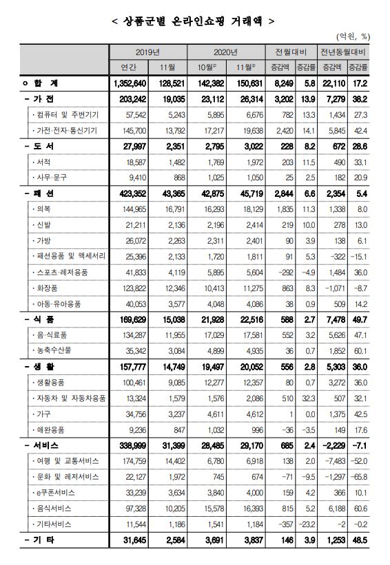 상품 부문별 온라인쇼핑 거래액은 전년동월대비 서비스(-7.1%)에서 감소했으나, 식품(49.7%), 가전(38.2%) 등에서 증가했다. 전월대비로는 가전(13.9%), 패션(6.6%), 서비스(2.4%) 등 모든 부문에서 증가했다.