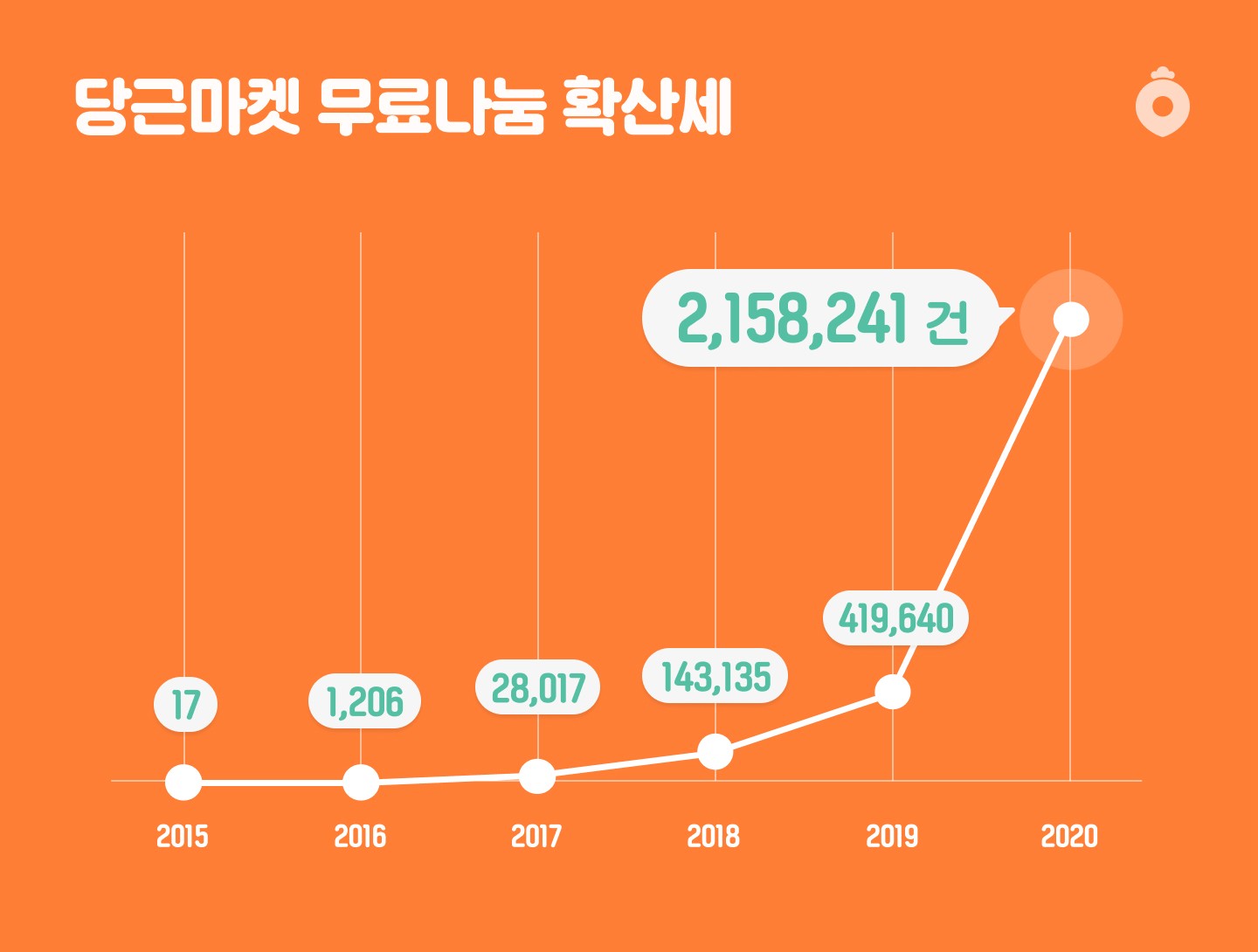 지난 2016년 1200여건으로 시작된 이웃간 나눔은 2017년 2만8000건을 넘어섰고, 이듬해인 2018년에는 14만건을 훌쩍 뛰어 넘었다. 구글플레이 ‘올해의 베스트 앱’으로 선정된 2019년에는 41만건에 달했고, 1300만 월간 사용자수를 기록한 지난해에는 무려 215만건까지 치솟으며 1년새 무료 나눔의 참여가 5배 이상 폭발적으로 확산됐다. 당근마켓의 무료 나눔은 동네 방방곡곡으로 퍼져 나가며 이웃 간 온정을 나누는 나눔 문화의 중심으로 빠르게 자리잡았다.