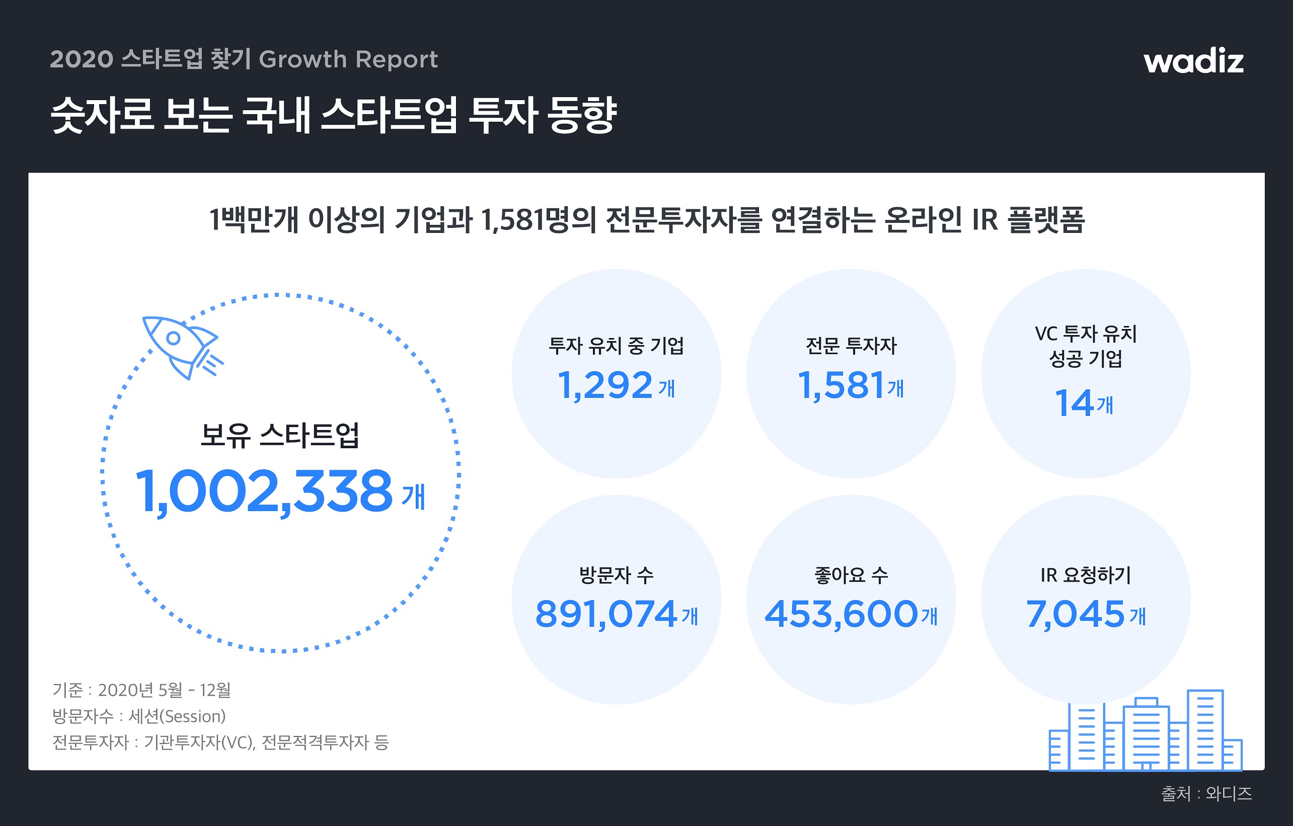 이번 보고서는 2020년 한 해 동안 ‘스타트업 찾기’를 통해 누적된 스타트업과 투자자 정보를 바탕으로 스타트업 투자 시장의 트렌드를 한눈에 확인할 수 있는 데이터 기반의 동향과 인사이트를 담고 있다.