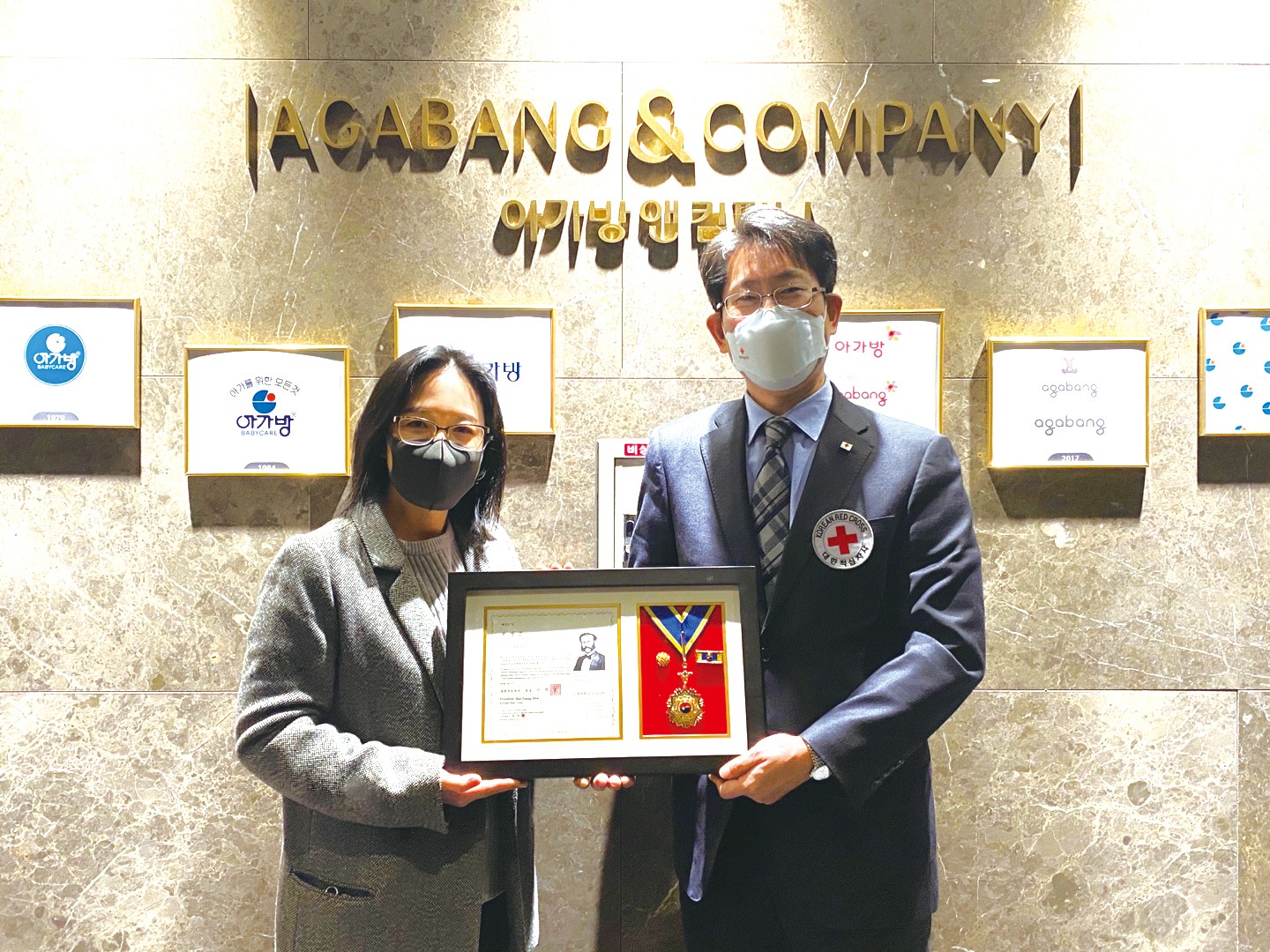 아가방앤컴퍼니 박소정(왼쪽) 본부장이 대한적십자사 서부봉사관 안성현 관장으로부터 ‘회원유공장 명예장’을 전달받고 있다.