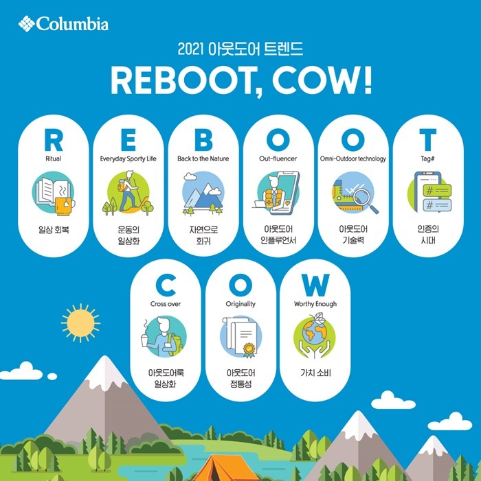 컬럼비아는 ‘REBOOT, COW!’의 각 알파벳 앞 글자에 따라 9가지 세부 키워드를 제시했다. 각 키워드가 의미하는 것은 ▲일상 회복(Ritual) ▲운동의 일상화(Everyday Sporty Life) ▲자연으로 회귀(Back to the Nature) ▲아웃플루언서(Out-fluencer) ▲아웃도어 기술력(Omni-Outdoor Technology) ▲인증의 시대(Tag#) ▲아웃도어 의류의 일상화(Cross Over) ▲정통성(Originality) ▲가치소비(Worthy Enough)다.