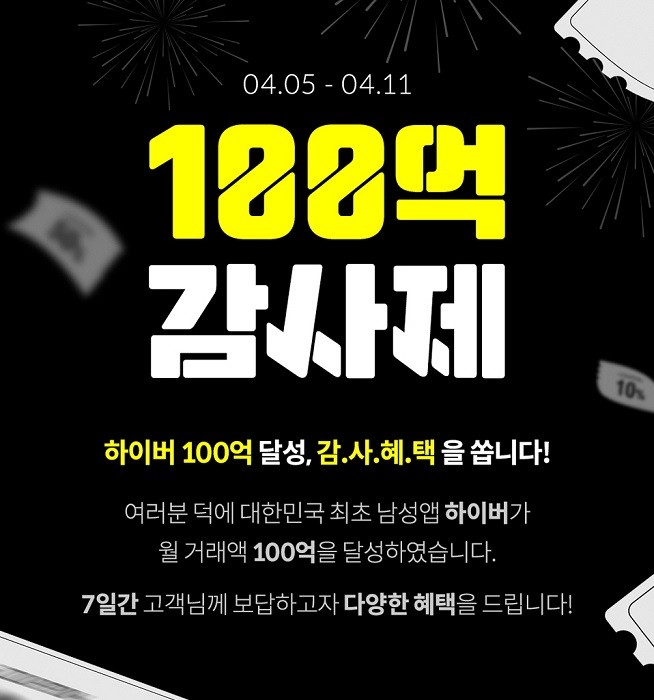 브랜디(대표 서정민)가 운영하는 남성앱 ‘하이버’는 올해 3월 월간 거래액 100억원을 달성했으며, 이를 기념해 오는 4월 5일부터 11일까지 고객 감사제를 실시한다.