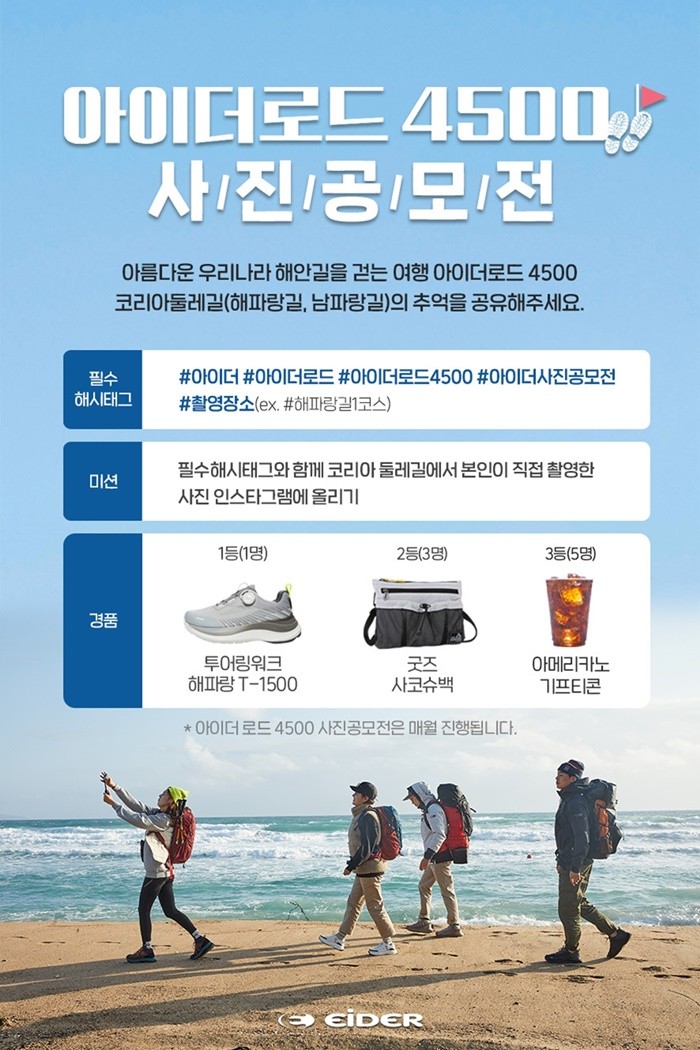 전국 방방곡곡 대한민국의 아름다운 모습을 담은 사진을 공유하는 ‘아이더로드4500 사진공모전’도 매월 진행된다. 아이더로드4500의 공식 코스인 해파랑길과 남파랑길 코스에서 본인이 직접 촬영한 사진을 필수 해시태그와 함께 개인 인스타그램에 업로드하면 된다. 코스를 완주하지 않아도 되며, 각 코스에 포함된 여행지에서 찍은 사진으로도 참여 가능하다. 매월 1일부터 말일까지 응모 가능하며, 수상작은 매월 15일 전후로 발표된다.