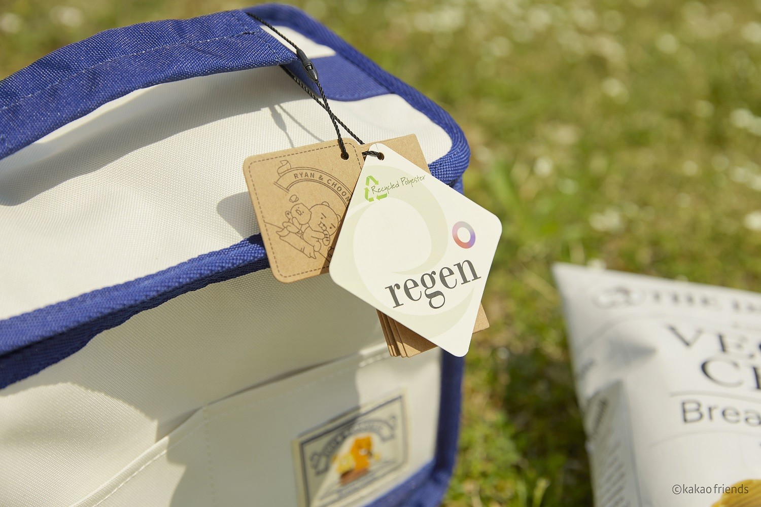 카카오프렌즈는 올해부터 원자재와 포장재 모두를 친환경화하고 있다. 그 첫 시도로 효성티앤씨의 ‘리젠’이 채택됐다. 프렌즈 그린라이프 보냉백은 재료부터 포장까지 친환경 소재를 이용해 제작한다. 플라스틱 폐기물을 줄이기 위해 500ml 페트병 3.3개로 보냉백 1개를 만들고 제품을 친환경 비닐로 포장한다.