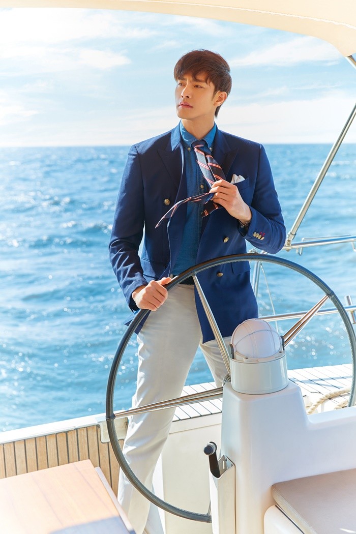 ‘60’s 솔리드 더블 블레이저’는 클래식 핏의 멋스러운 이중 여밈 재킷이다. 정통 블레이저 디자인을 살리기 위해 금장 버튼과 네이비 컬러를 활용했고, 가벼운 촉감과 신축성이 우수한 울 혼방 소재를 사용했다. 화보 속 성훈은 같은 계열의 컬러 셔츠와 밝은 색의 팬츠를 매치해 깔끔하면서도 세련된 룩을 완성했다.