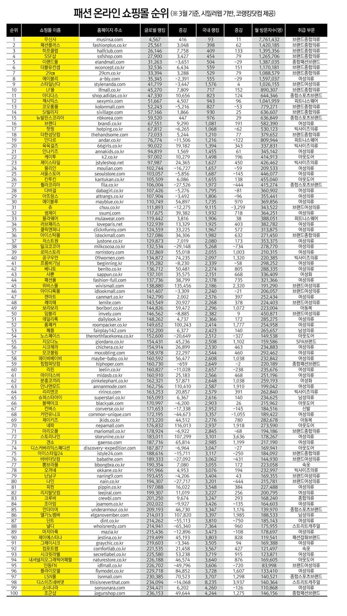 www.koranking.com)의 협조를 받아 조사한 ‘3월 패션 온라인 쇼핑몰 순위’에 의하면 100위권 쇼핑몰 중 65%가 글로벌 랭킹이 상승했다. 특히 2월에는 월 방문자 수가 100만 명이 넘은 쇼핑몰이 5개에 불과했으나 3월에는 5개 늘어난 10개에 달했다.