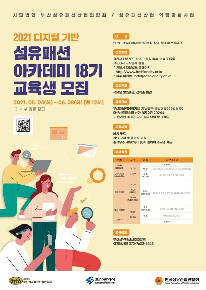 부산섬유패션산업연합회는 오는 30일까지 ‘2021 디지털기반 섬유패션 아카데미 18기’에 참여할 교육생을 모집한다. 섬유패션 아카데미 교육은 부산 섬유패션산업 경쟁력 강화 및 일자리 창출을 위해 마련했다. 5월 4일부터 6월 8일까지 부산패브릭메이커랩(부산진구)에서 총12회에 걸친 교육을 실시한다.