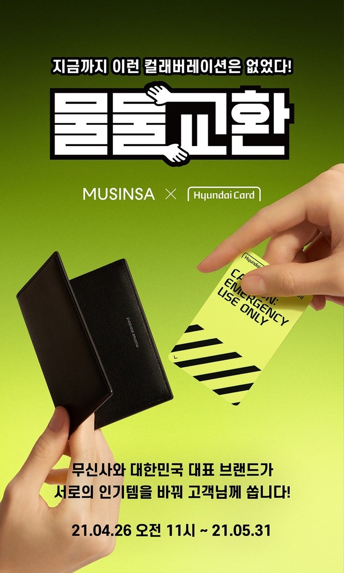 이번 물물교환은 국내 온라인 패션 플랫폼 최초로 선보인 ‘무신사 현대카드’ PLCC 공개를 기념해 성사됐다. 현대카드는 무신사 스토어 회원을 위해 1만 원이 선불 충전된 이머전시 카드 (Emergency Card) 7,000개를 준비했다. 무신사는 현대카드 이용 고객을 위해 한정판으로 제작한 무신사 스탠다드 카드지갑을 선물할 계획이다.