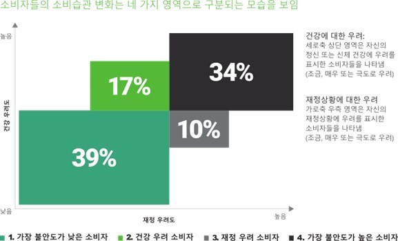 각 그룹별로 ‘가장 불안도가 높은 소비자’는 전체 응답자의 34%를 차지했으며, ‘건강 우려 소비자’, ‘재정 우려 소비자’, ‘가장 불안도가 낮은 소비자’는 각각 17%, 10%, 39%를 차지했다.