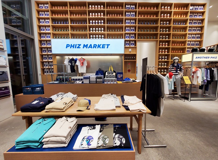 피즈의 매장은 ‘피즈마켓’을 테마로 꾸며졌다. 티셔츠, 셔츠, 바지 등의 의류는 물론 토트백, 컨버스백, 볼캡, 버킷햇, 휴대폰 케이스, 비어캔글라스 등 액세서리 및 굿즈에 이르기까지 피즈가 전개하는 모든 아이템을 선보여 마치 슈퍼마켓에서 쇼핑을 하는 듯한 즐거운 경험을 선사하는 것이 특징이다. 익살스러운 캐릭터와 톡톡 튀는 색감을 강점으로 하는 브랜드 정체성을 매장 곳곳에 인테리어로 반영해 역동적인 에너지를 전면에 드러낸다.