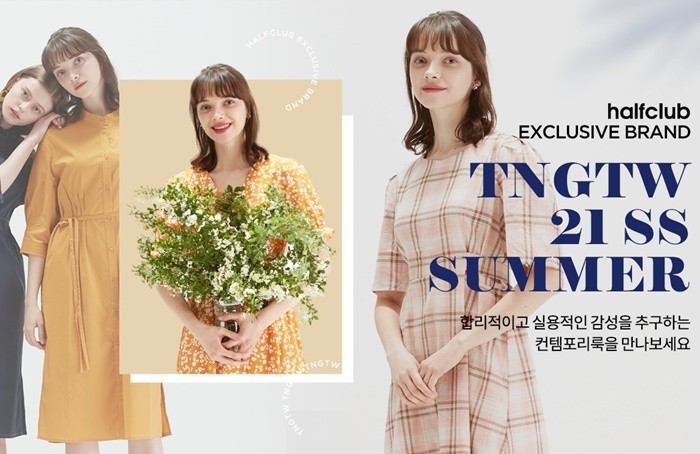 합리적이고 실용적인 감성의 컨템포러리룩 TNGTW는 하프클럽에서 독점 세일을 실시한다. 시원한 소재의 컴팩트 수트 셋업을 기존가의 반값인 2만 9800원에 판매하며 H라인 정장 원피스는 87% 세일가인 7500원에 선보인다.