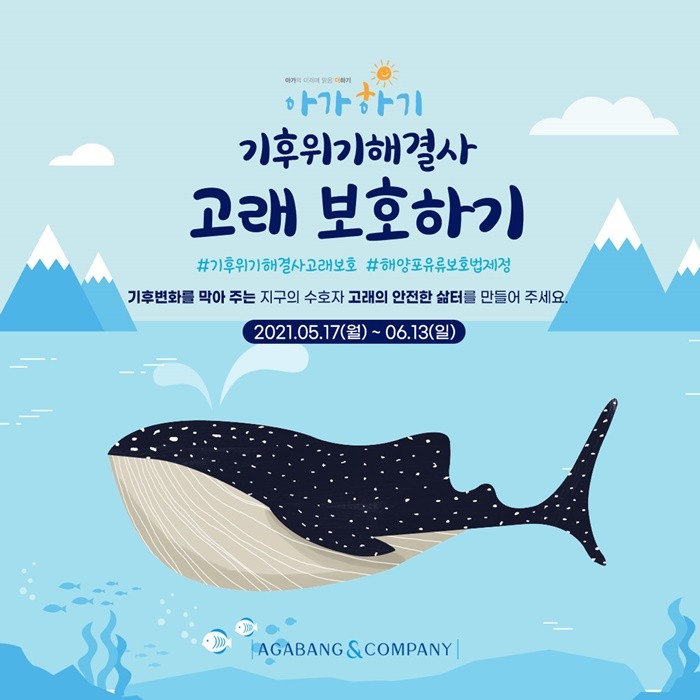 아가방앤컴퍼니가 지구 환경과 고래 보호를 위한 친환경 캠페인을 17일부터 전개한다. 이번 캠페인은 ‘기후 위기 해결사 고래 보호하기‘ 타이틀로 기후 변화를 막아주는 고래의 중요성을 알리고 보호하기 위한 목적으로 ▲해양포유류를 보호하기 위한 서명 캠페인 ▲고래 스티커 인증하기 이벤트 ▲고래 아이템 구매 시 환경 단체에 기부되는 프로그램들이 마련돼 있다.