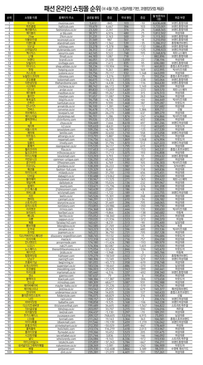 www.koranking.com)의 협조를 받아 조사한 ‘4월 패션 온라인 쇼핑몰 순위’에 의하면 100위권 쇼핑몰 중 57개가 글로벌 랭킹이 상승했다. 3월에는 65개가 상승했었다. 월 방문자 수가 100만 명이 넘은 쇼핑몰은 3월과 같은 10개였다. 2월에는 5개였다.