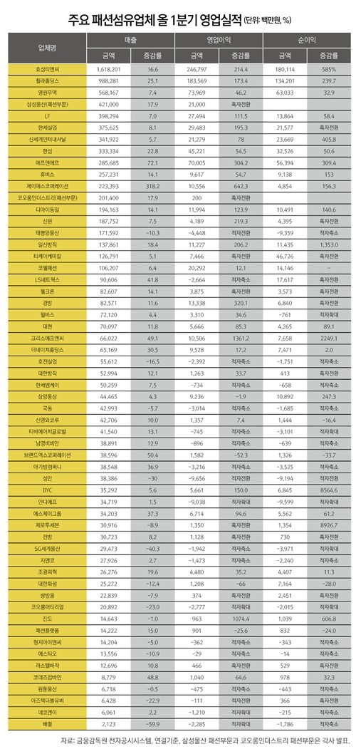 내수 기반의 대기업 패션업체들도 실적 반등에 성공했다. 삼성물산 패션부문은 올 1분기 전년비 17.9% 증가한 4210억원의 매출을 기록했다. 영업이익은 210억원으로 흑자전환했다. 지난해 1분기 310억원의 적자를 기록한 것에 비하면 크게 달라진 모습이다.