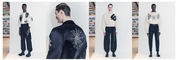 특히, 이번 남성 가을/겨울 시즌에서는 크리스털-불리온-비즈로 이루어진 비둘기, 하트, 태양 모티프 자수 디테일들이 니트나 셔츠에 수놓아져 전체적으로 단단하고 묵직한 분위기의 룩에 섬세한 무드를 더했다.