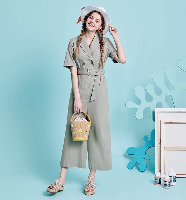 공개 화보에서는 V넥 테일러 카라와 아웃 포켓 디자인, 벨트 장식이 돋보이는 7부 기장의 점프수트 착장으로 코지하면서 자유분방한 무드를 연출했다. 시원스러운 민트 컬러가 돋보이는 아이템으로 플라워 라탄백과 파나마 햇을 더해 썸머 바캉스 룩으로도 손색없는 아웃핏을 선보였다.