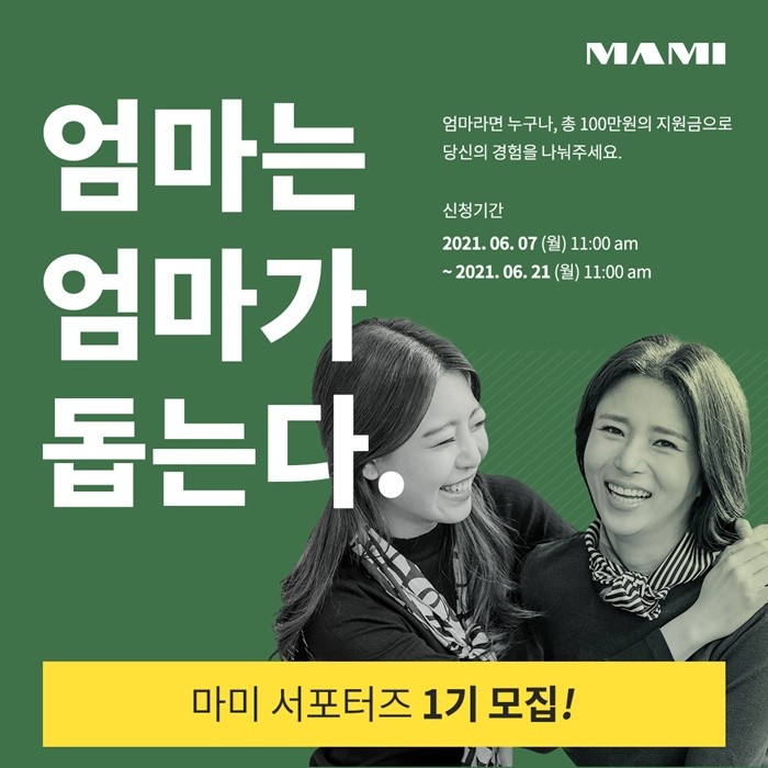 모집은 오는 6월 21일까지 약 2주간 진행되며, 최종 명단은 마미 공식 홈페이지에서 6월 28일 발표될 예정이다. 모집 인원은 총 100명이며, 활동 기간은 오는 7월부터 11월 말까지 총 5개월이다. 마미 서포터즈는 엄마, 육아대디 등 0세부터 7세까지 미취학 아동에 대한 육아 경험이 있는 누구나 신청 가능하다.