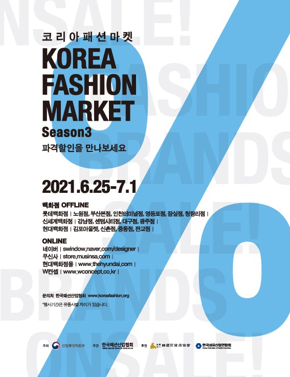 산업통상자원부(장관 문승욱)가 오는 6월 25일부터 7월 1일까지 국내 유명 백화점과 온라인 패션 전문몰에서 패션업계의 내수 회복을 돕기 위한 대규모 패션상품 특별할인판매 행사인 ‘코리아패션마켓 시즌3’를 개최한다.