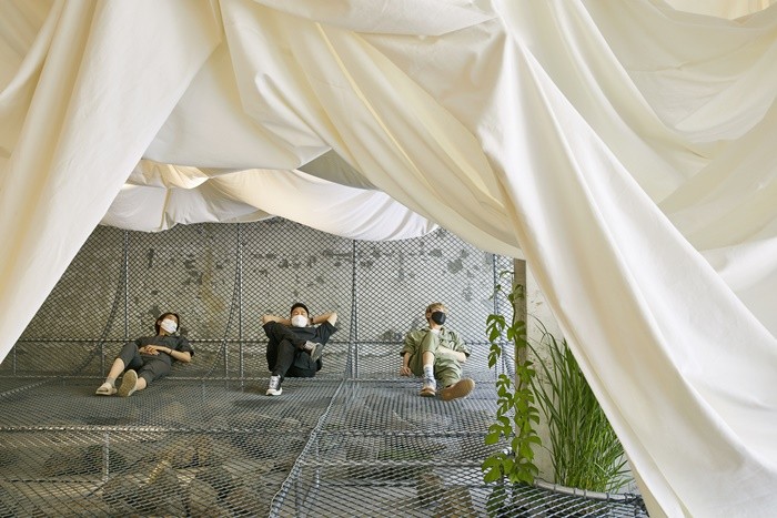 ‘캠핑 에브리웨어’는 텐트, 타프, 해먹과 같은 캠핑에 있어서 가장 큰 구조물을 이루는 용품의 소재를 사용하여 산의 지형을 표현하고, 그 안에 휴식 공간을 배치해 마치 캠핑을 떠난 것과 같은 느낌을 주도록 기획했다.