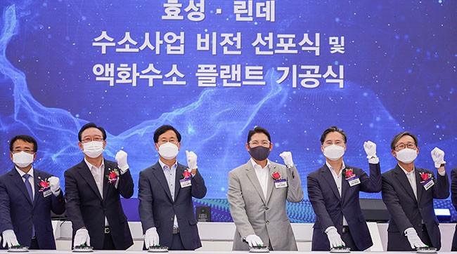 국내 수소충전시스템 시장점유율 1위를 차지하고 있는 효성중공업과 글로벌 가스 및 화학 전문기업인 린데가 21일 울산시 효성화학 용연공장 부지에서 수소 사업 비전 선포 및 액화수소플랜트 기공식을 개최했다. 이날 행사에는 조현준 효성 회장과 성백석 린데코리아 회장을 비롯해 송철호 울산시장, 박진규 산업통상자원부 차관, 조현상 효성 부회장, 이상운 효성 부회장 등이 참석했다.