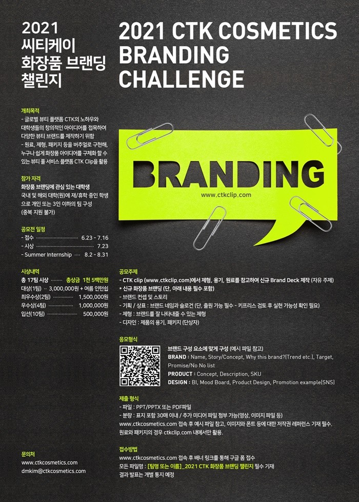 www.ctkcosmetics.com) 배너에 링크된 구글 폼 서식을 통해 신청할 수 있으며, 화장품 브랜딩에 관심있는 국내외 대학(원)에 재/휴학 중인 대학생이라면 누구나 개인 혹은 3인 이하의 팀 단위로 참가할 수 있다.