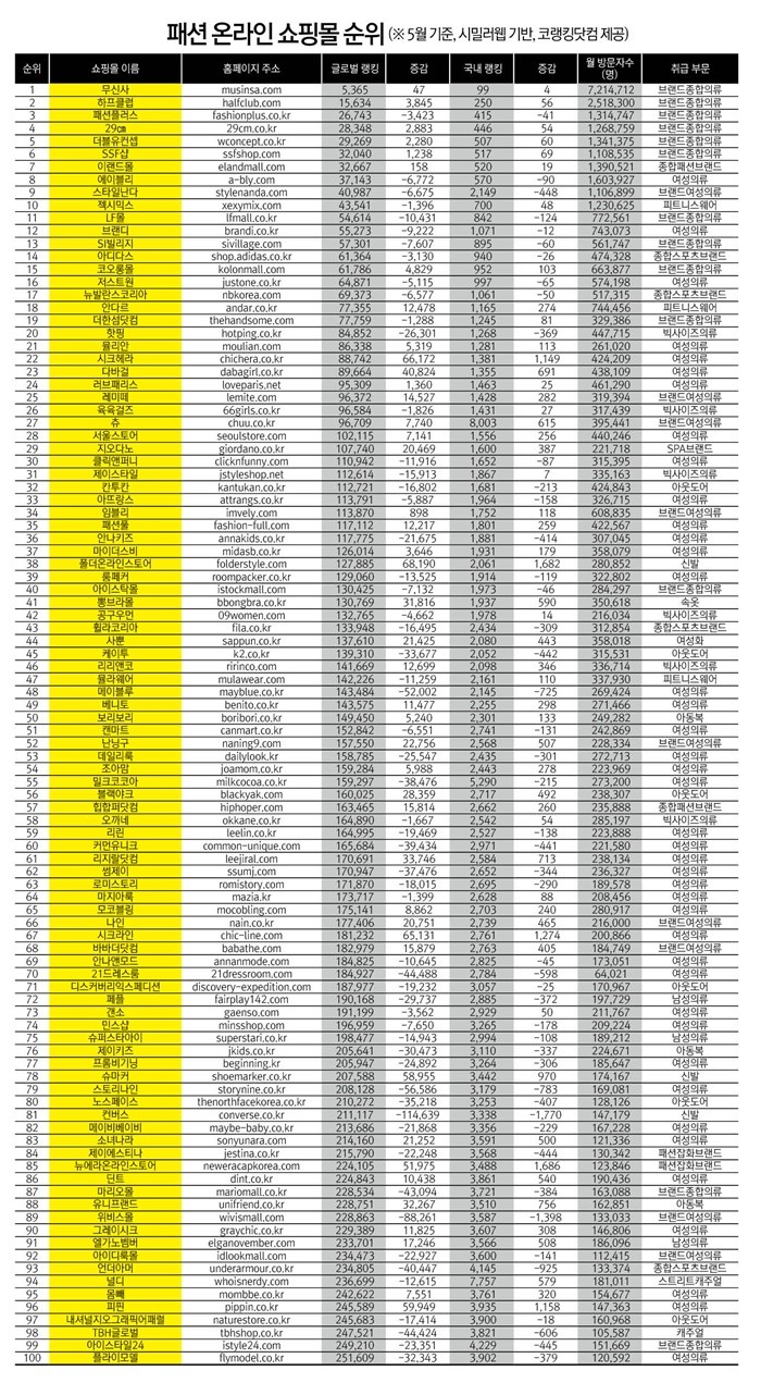 방문자 수와 검색량, 체류 시간 등을 종합적으로 평가해 매긴 패션 부문 글로벌 랭킹 1~10위는 무신사, 하프클럽, 패션플러스, 29㎝, 더블유컨셉, SSF샵, 이랜드몰, 에이블리, 스타일난다, 젝시믹스 순으로 조사됐다. 4월에는 무신사, 하프클럽, 패션플러스, 에이블리, 29㎝, 더블유컨셉, 이랜드몰, SSF샵, 스타일난다, 젝시믹스 순이었다. 새로 진입한 쇼핑몰 없이 일부 쇼핑몰의 순위 변동이 있었다.