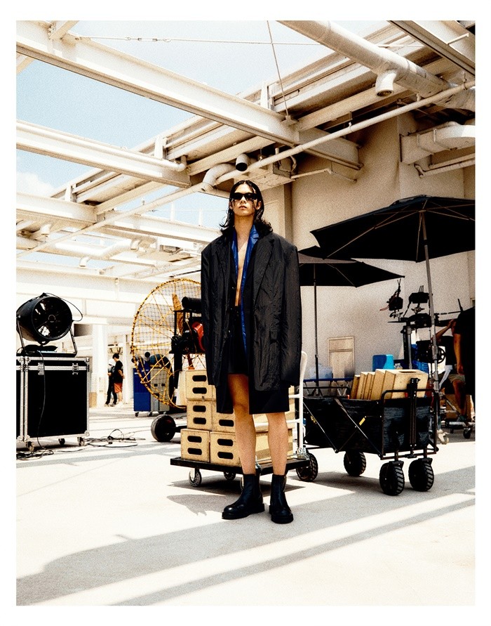 또 어깨가 강조되고 허리가 단단하게 조여진 테일러드 재킷에 바람에 흩날리는 가벼운 합섬 볼륨 스커트를 매칭해 소재의 콘트라스트 효과를 높였다. 오버사이즈 실루엣에 파격적인 미니 렝스의 팬츠, 스커트와 밀리터리 모티브의 액세서리를 조합해 새롭고 유니크한 스타일링을 선보였다. 블랙, 네이비, 그레이, 카키 컬러를 중심으로 아이템에 반영했고, 블루와 레드를 포인트 컬러로 활용했다.