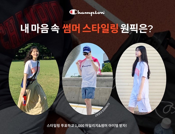이번 이벤트는 챔피온 서포터즈 1기의 마지막 미션인 ‘여름 스타일링’에 대한 고객 인기 투표다. 챔피온 반팔 티셔츠를 활용한 서포터즈의 각양각색 스타일링을 소개하고 고객들과 쌍방향으로 소통하고자 마련된 행사로, 투표에 참여한 모든 고객들에게 온라인 스토어에서 즉시 사용 가능한 1,000 마일리지를 지급한다. 또, 투표 참여자 가운데 추첨을 통해 챔피온 ‘반팔 티셔츠’, ‘로고 짐색’, ‘에코백’ 등 여름 패션 아이템을 선물로 증정한다.